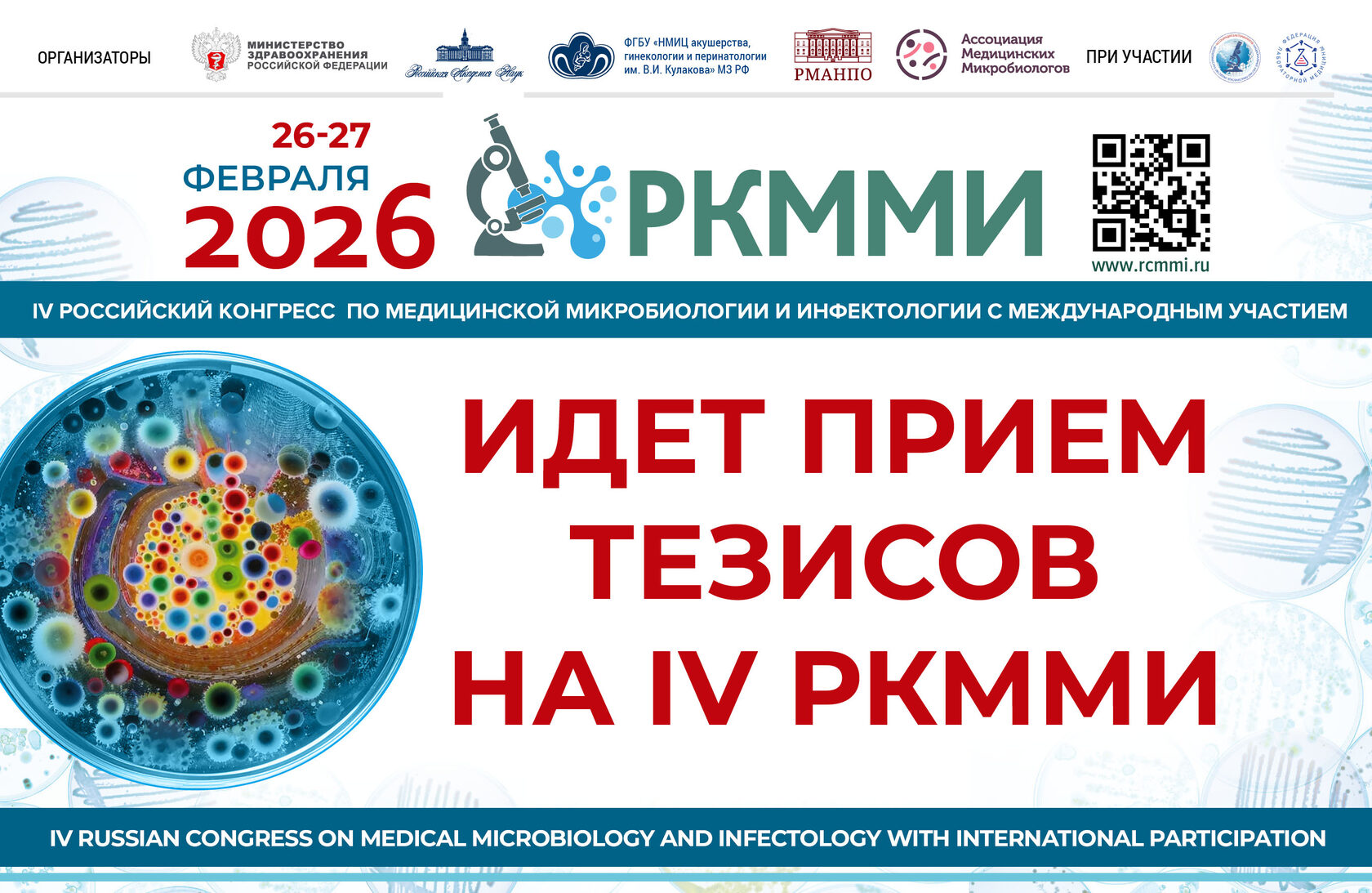 Продолжается прием тезисов на IV Российский конгресс по медицинской микробиологии и инфектологии, который будет проходить в Москве 26-27 февраля 2026 года.